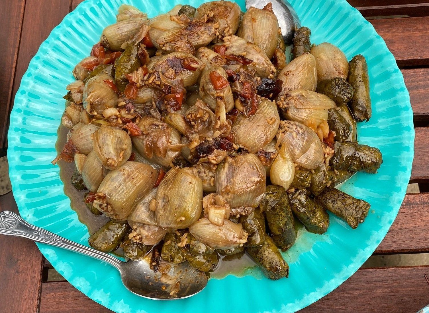 Dolma is vine leaves and vegetables stuffed with a rice mix. Its popular all around the meditterainian and has its own Iraqi varieites including a vegan version cooked with loive oil